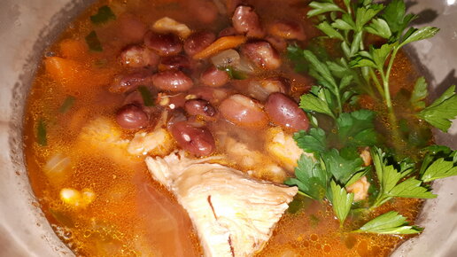 Томатный суп с курицей, фасолью и овощами