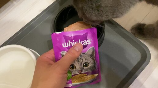 Кот пробует корм Whiskas / Жидкий корм Вискас паштет с курицей и индейкой