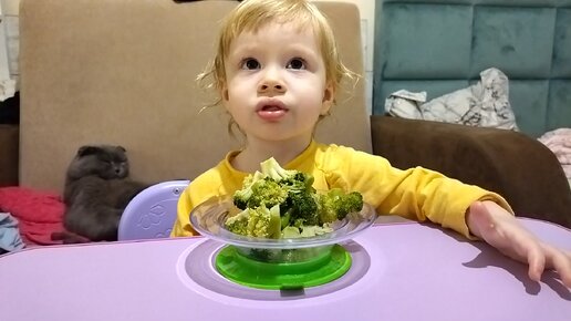 Доченька кушает брокколи, словно чёрную икру. А рядом её охранник Гектор
