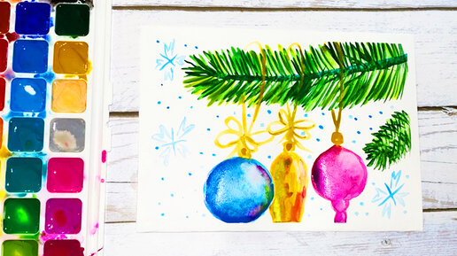 Как нарисовать елочную ветку с игрушками. Новогодний рисунок
