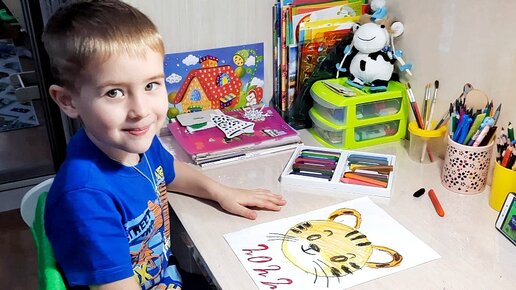 Рисуем символ нового года 🐯 и снеговика⛄| Периодически предлагаю Кирюше рисовать по видеоурокам, аккуратненько получается😍