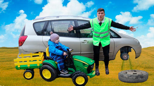 Машина сломалась, отвалилось колесо! На большом тракторе малыш приехал и помог починить автомобиль