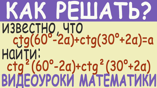 Известно, что ctg(60-2α)+ctg(60+2α)=a. Найти ctg²(60-2α)+ctg²(30+2α) Тригонометрия Подробное решение