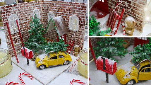 Атмосферная миниатюра зимнего дворика с ёлочкой, машинкой и снегом / Новогодний декор своими руками