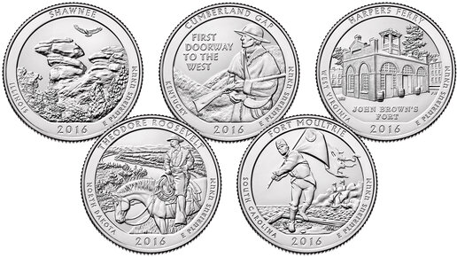 Монеты 25 центов из серии Прекрасная Америка выпуска 2016 года.