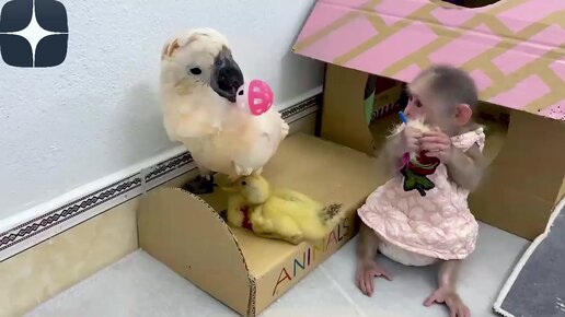 Маленький Биби помогает папе ухаживать за попугаем и утенком