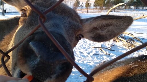 Олени хрумкают морковку на оленьей ферме