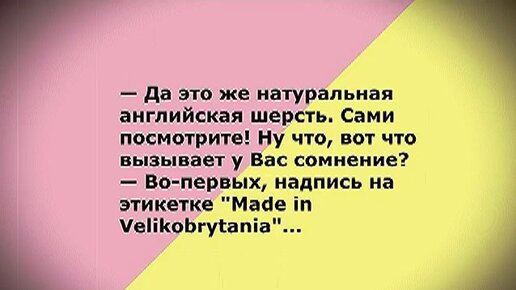 - Да это же натуральная английская шерсть. Сами посмотрите! Ну что, вот что вызывает у вас сомнение? - Во-первых, надпись...