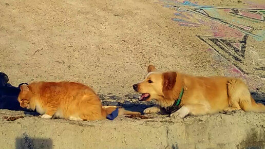 Настоящая дружба рыжего котика и доброй рыжей собаки у чёрного моря