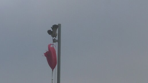 Ялта. Сильный ветер. Какая-то белогвардейская птица упорно набрасывается на красный флаг спасателей, пытаясь его сорвать