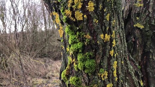 Старое дерево покрыто разноцветными лишайниками, очень живописно.