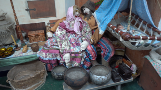 Шерсточесальная машина, ткацкий станок и реконструкция избы эпохи XIX века в музее "Русские валенки" в городе Москве