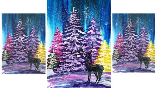 Как нарисовать сказочный лес. Нарисуем зимний пейзаж. Рисуем оленя в лесу. Новогодний рисунок.