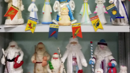 Новогодние игрушки, куклы и хлопушки ждут встречи Нового года.