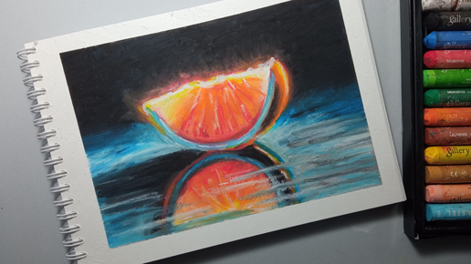 Рисую сочную, светящуюся дольку апельсина масляной пастелью