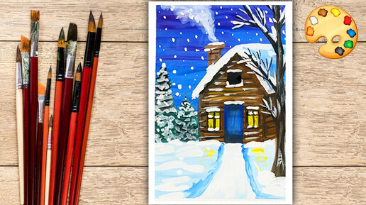 Как нарисовать красивый зимний пейзаж гуашью. Пошаговое рисование