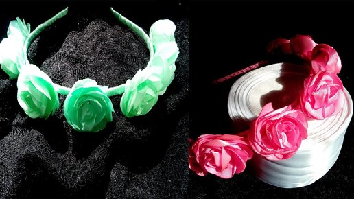 Ободок с розами из лент/ Розы из лент/Цветы из лент