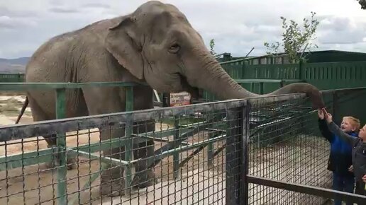 Слон доволен и улыбается посетителям, пытается поднять людям настроение, чтобы получить свое яблочко
