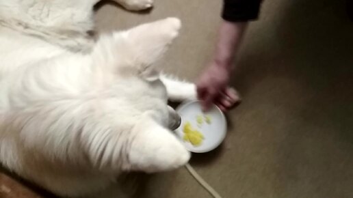 Предлагаем белой швейцарской овчарке поесть из кошачьей миски. Собака отказывается