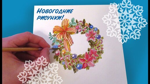 Новогодние рисунки. Рисуем пошагово Рождественский венок акварелью