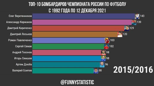 Топ-10 бомбардиров Чемпионата России по футболу с 1992 года по 12 декабря 2021