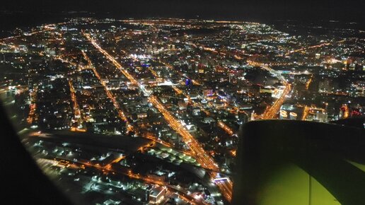 Ночной Новосибирск: вид с высоты из самолета - Красный проспект, Ипподромка, вокзал Главный