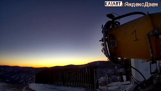 Вечер, отличная погода и красивый закат на вершине горнолыжного курорта "Банное". Заснежены только 3 и 4 трассы. Людей — минимум