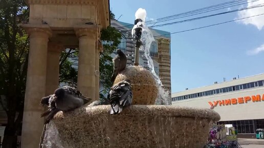 Голуби плещутся в фонтане и пьют из него воду