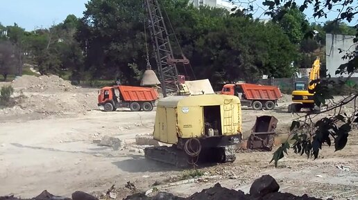 Старый экскаватор-драглайн Э-652Б работает с трамбовкой