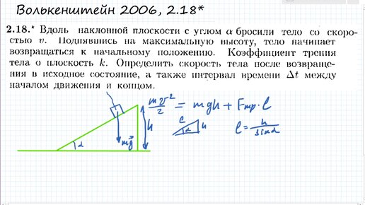 Вдоль наклонной плоскости с углом альфа бросили тело со скоростью V: Волькенштейн 2.18