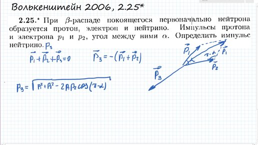 При бета-распаде покоящегося первоначально нейтрона образуется протон, электрон и нейтрино: Волькенштейн 2.25