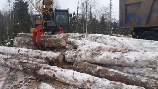 Первый раз гружу бревна экскаватором.