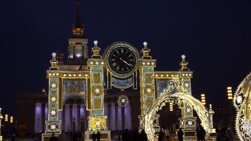 Территория ВВЦ в городе Москве зимним вечером