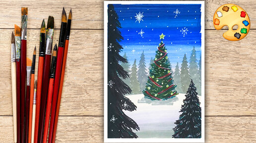 Простой рисунок к Новому Году маркерами. Рисуем новогоднюю ёлку. Зимний пейзаж
