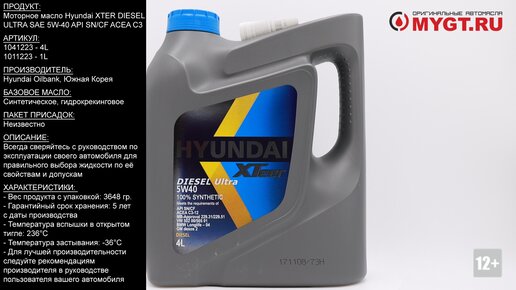 Моторное масло Hyundai XTER DIESEL ULTRA SAE 5W-40 API SN/CF ACEA C3 4L #ANTON_MYGT