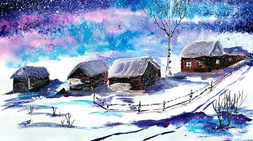 Нарисуем зиму в деревне. Деревенский пейзаж. Зимний пейзаж.