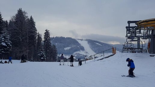 Буковель. Трасса 9 и 3А. Встретил школу лыжников и сноубордистов.