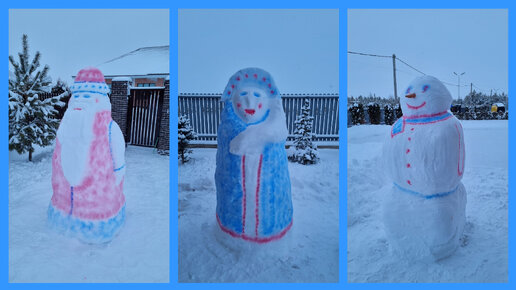 Фигуры из снега готовы. Дед мороз, снегурочка, снеговик.