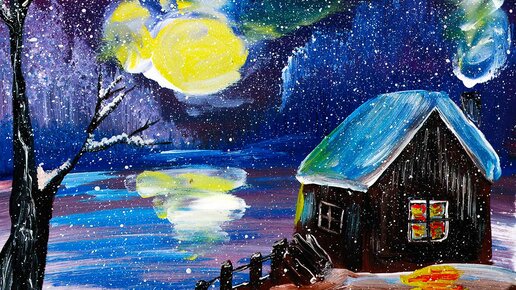 Нарисуем зимний пейзаж. Рисуем домик зимой. Домик на озере.