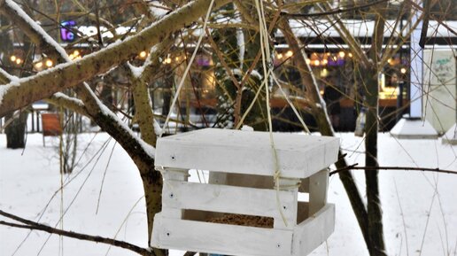 Биосфера. Первый серьёзный снегопад. Вешаем новую деревянную кормушку для маленьких птичек