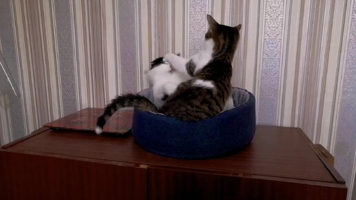 Кошка не уступала своим сыновьям лежанку, но потом в их семье наступил мир