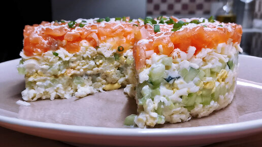 Салат с семгой на Новый год. Нежное сочетание ингредиентов, красивая подача на праздничный стол