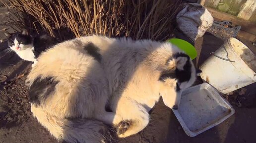 После морозного утра греются на солнышке. Симба даже задремал . Питомцы деревенского двора .