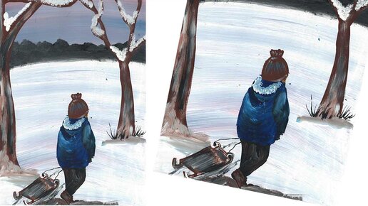 Нарисуем мальчика с санками. Рисуем зимний пейзаж. Правополушарное рисование. Зима гуашью