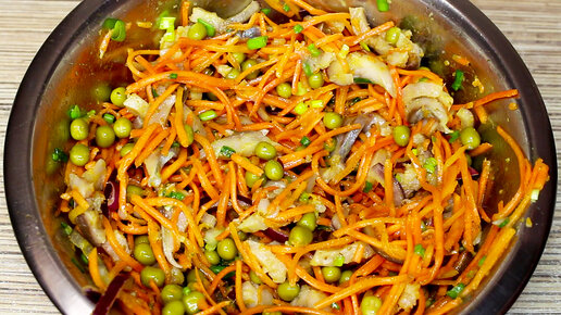 Салат с добавлением филе сельди, зеленого горошка и моркови по-корейски (вариант быстрого рецепта на новогодний стол)