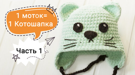 Детская шапка крючком из плюшевой пряжи / Вязаная велюровая шапочка с ушками в форме кота / Часть 1