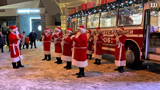 Дед Морозы играют новогоднюю мелодию из мультфильма «Ну, погоди!» – целый оркестр волшебников в Санкт-Петербурге