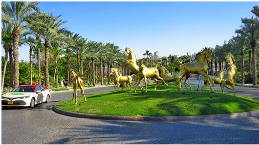 Табун золотых лошадей расположен у входа в отель Аль Каср в Дубаи, ОАЭ.