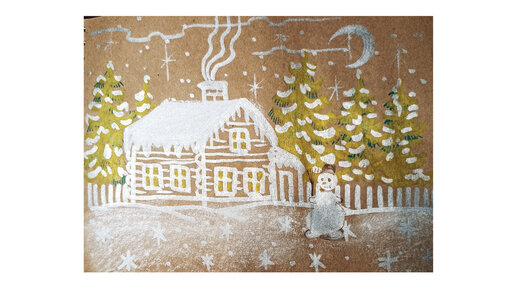 Снеговик у дома. Рисунок маркерами на крафтовой бумаге.