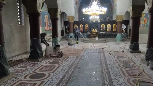Шлифовка и полировка каменного пола в церкви. Сербия.